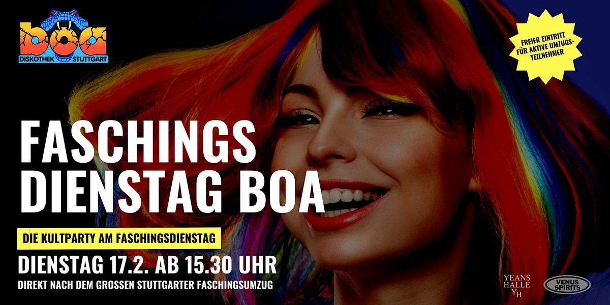 Die beste Faschingsparty der Innenstadt findet ab 15.30 Uhr nach dem großen Stuttgarter Faschingsumzug in der Boa statt dann öffnet Stuttgarts ältester Club zum After Faschingsclubbing. Einfach nach dem Umzug direkt in der Boa weiterfeiern! Heute erlebt Ihr die längste Boaparty des Jahres von 15.30 Uhr bis morgens um 3 Uhr.