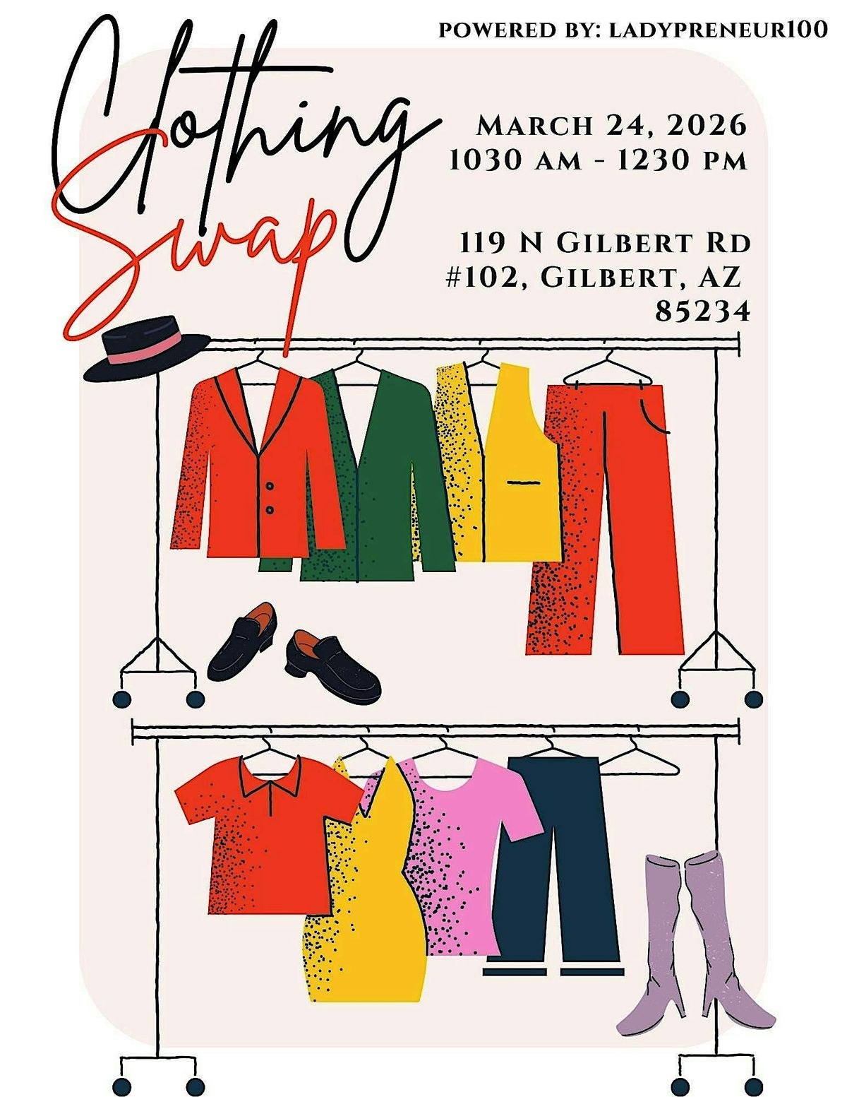 Bring your clean, gently loved clothing or accessories and trade them for something new-to-you. Each guest may bring 5–10 items, and swaps are one-for-one—simple, fun, and fair.
