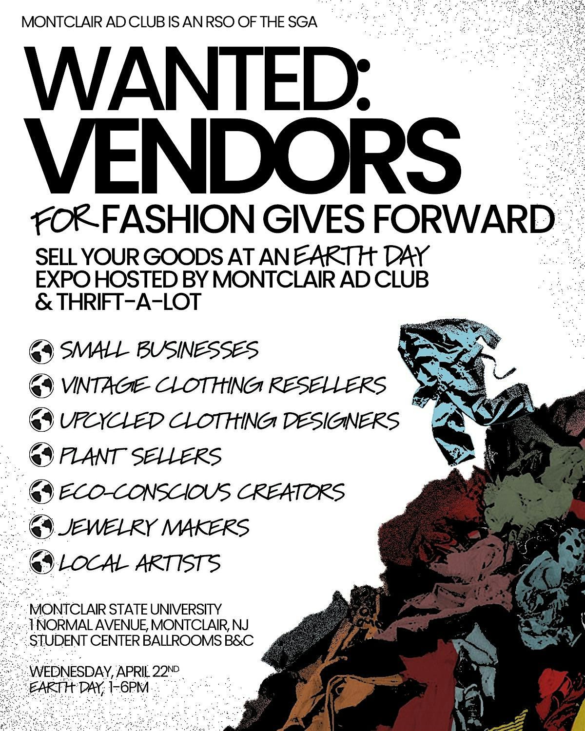 Montclair Ad Club (MAC) invites you to Fashion Gives Forward, an Earth Day flea market in celebration of circular fashion. We are looking for NJ/NY-local vendors and entrepreneurs with a creative spirit and view sustainability as core to their mission. Event vendor spots are open to anyone who sells second-hand or handmade clothing, accessories, plants, art, or other sustainable goods!