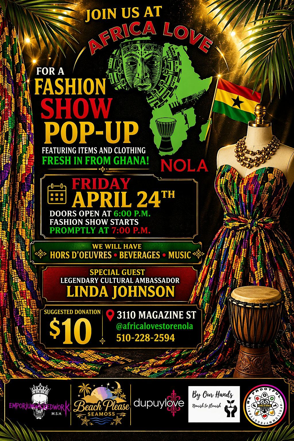 Hey Africa lovers! Get ready for an amazing Fashion Show Pop Up happening in person at Africa Love. Dive into the latest styles, vibrant designs, and the coolest vibes from The motherland ! Whether you're all about runway looks or just wanna soak in some creative energy, this event's got you covered. Don't miss out on this fabulous celebration of fashion and culture. Come through and experience the magic live!