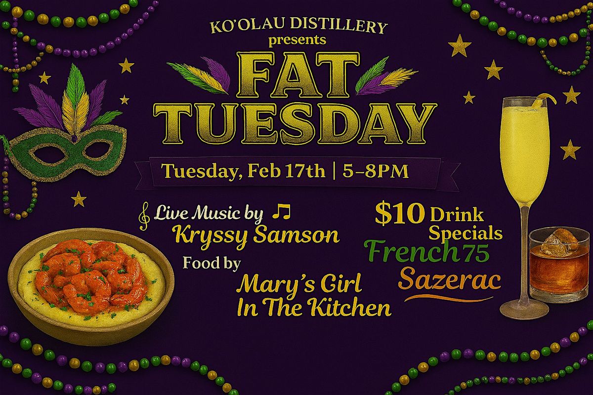 Join us for Fat Tuesday at Koʻolau Distillery, a festive Mardi Gras–inspired evening filled with great music, delicious food, and handcrafted cocktails. Celebrate in true New Orleans style with vibrant vibes, beads, and a lively atmosphere right here in Kailua.
