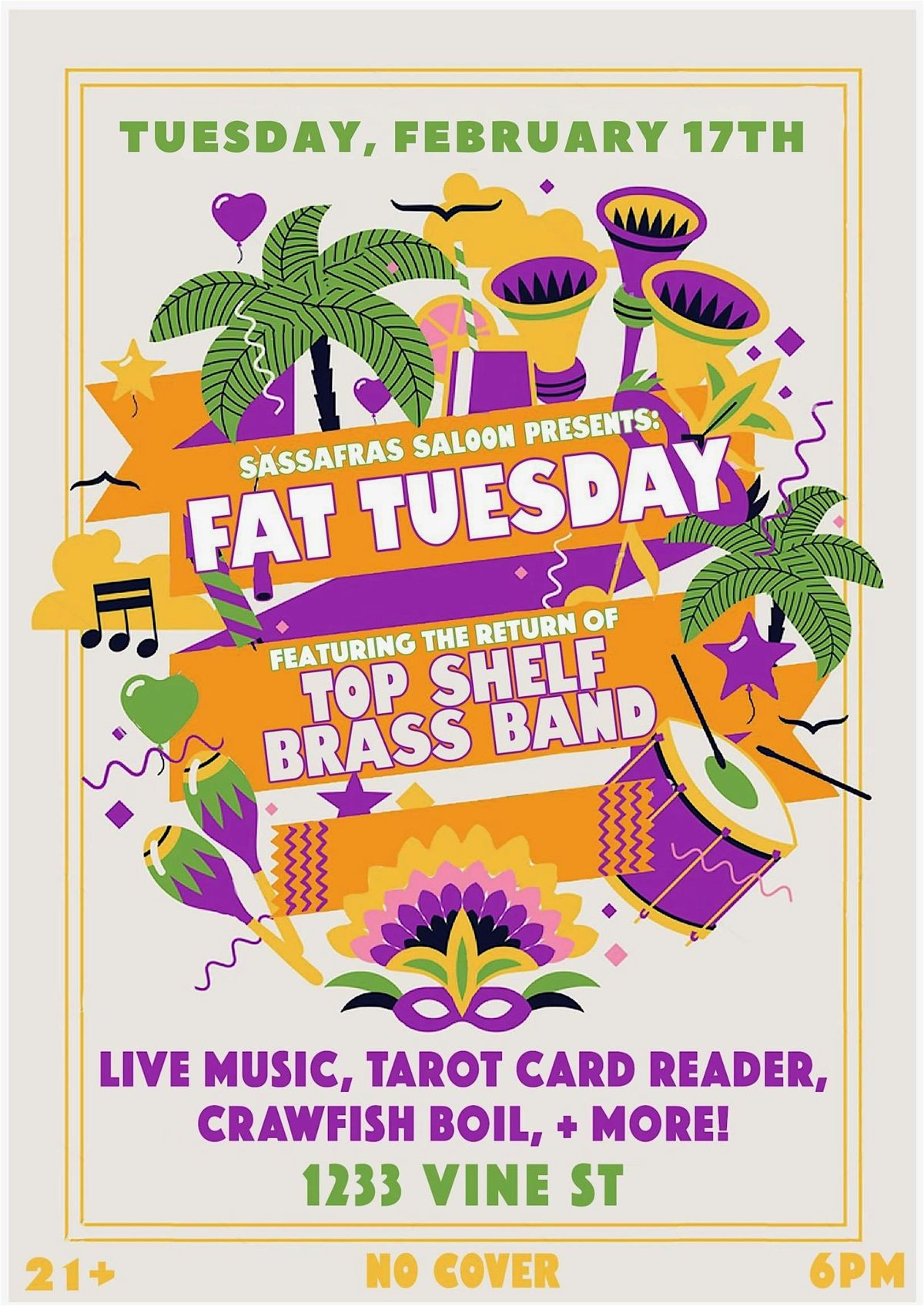 Join us for our annual Fat Tuesday Celebration! We have tarot readings, burlesque, a crawfish boil and the return of Top Shelf Brass Band!About this Event