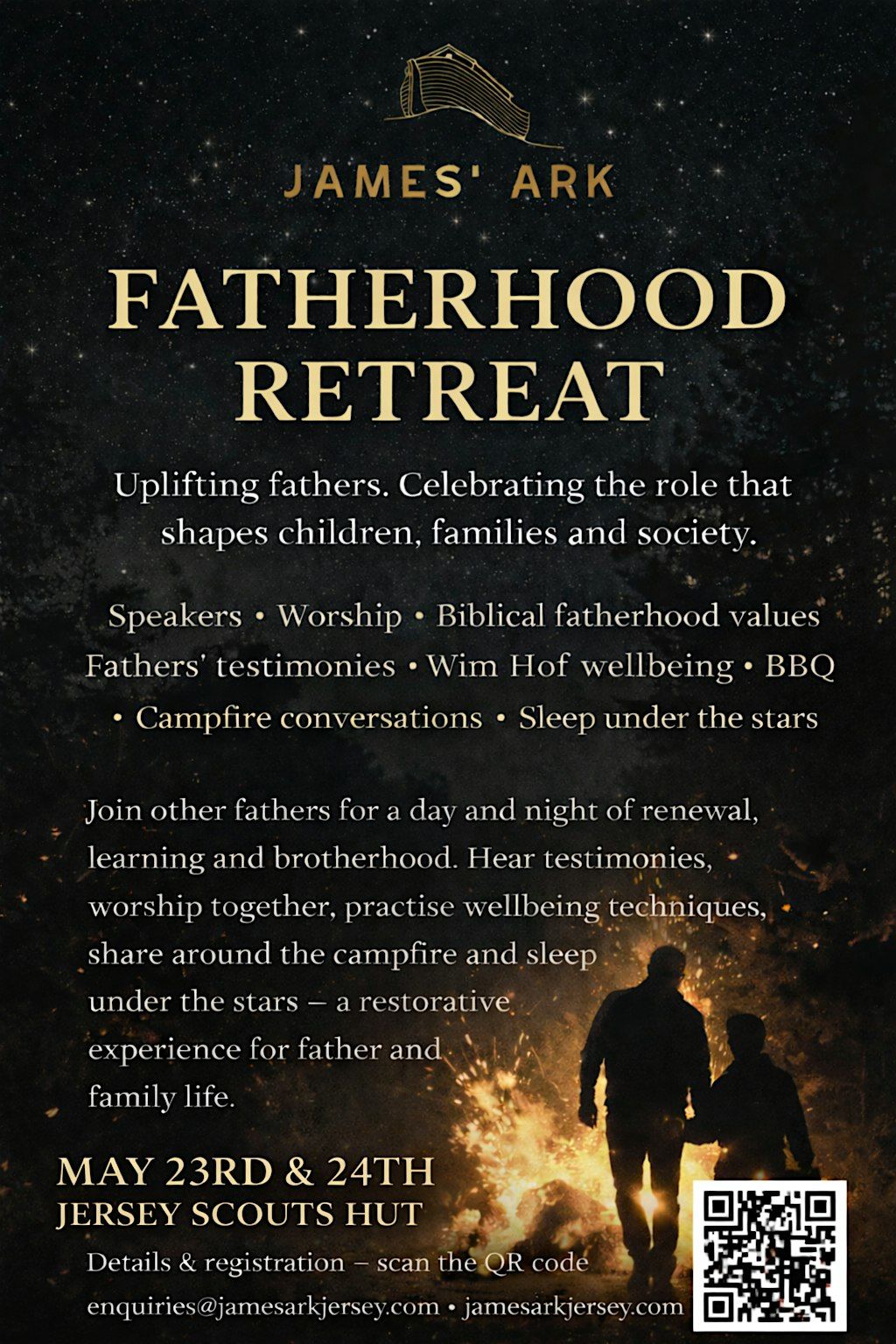 Step away from the noise of everyday life and reconnect with what matters most at the James’ Ark Fatherhood Retreat. Set under the open sky, this unique overnight camping experience at the Jersey Scouts Hut is designed to uplift and equip fathers through meaningful connection, spiritual growth, and shared moments of reflection. From powerful testimonies and worship to practical wellbeing practices and fireside conversations, this retreat creates space for renewal, brotherhood, and a deeper understanding of the vital role fathers play in shaping families and future generations. Spend the night in nature, around the campfire, and under the stars—returning home refreshed, grounded, and inspired.
