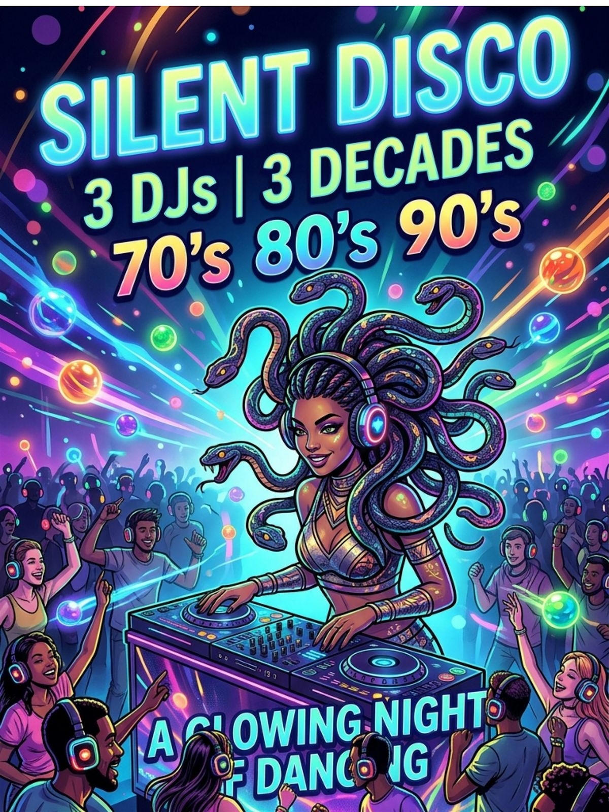 Join us in person for an epic night of classic beats from the 70's, 80's & 90's. Grab your headphones, pick your favorite era, and dance like nobody's watching! Whether you're all about the disco vibes, electric 80's synth, or 90's pop, this silent disco has got you covered. Don’t miss out on the fun and good vibes — it's gonna be a blast!