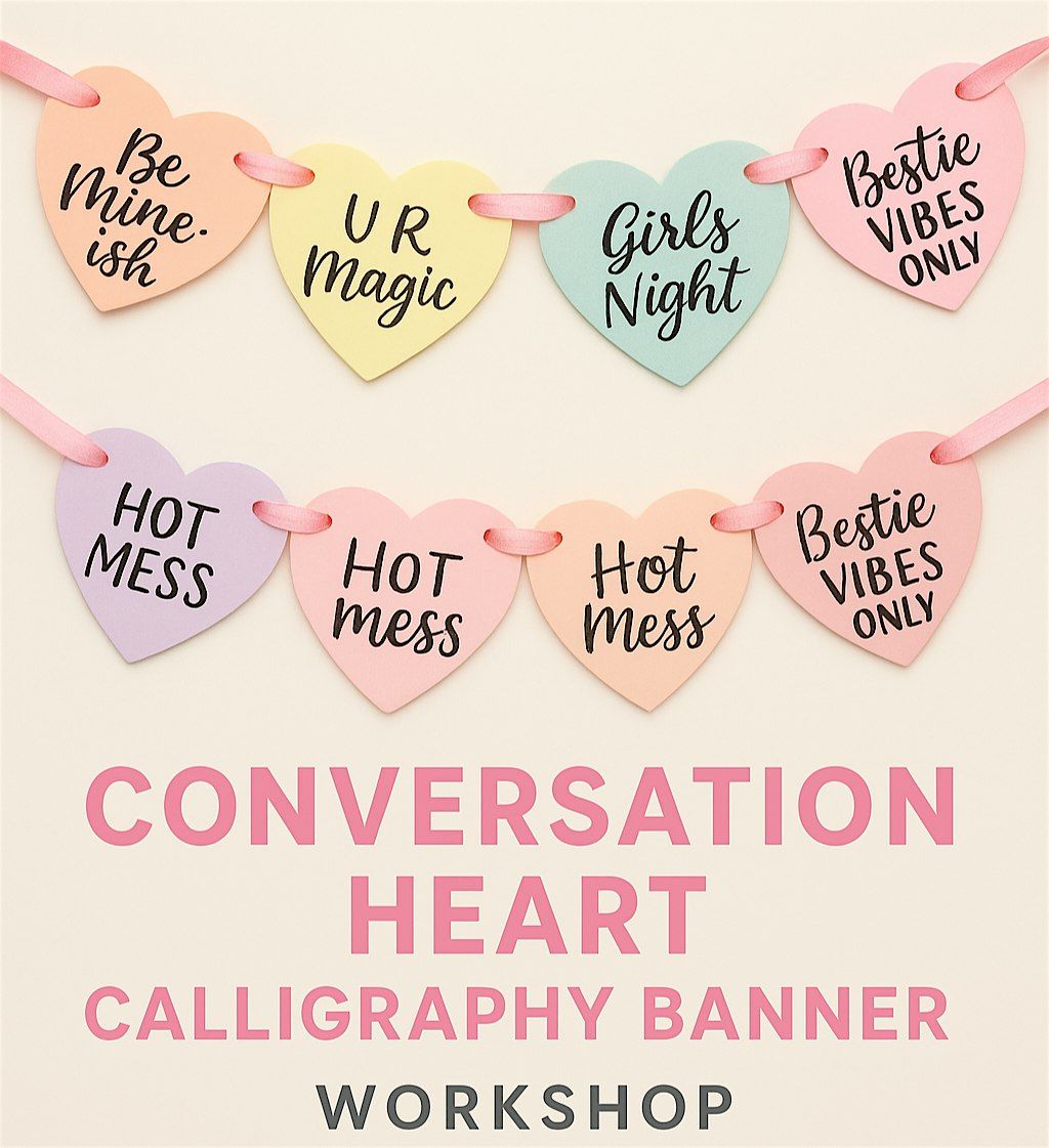 Learn faux calligraphy and create the featured Conversation Heart Banner, or pick a tote, clipboard, chalkboard sign, or birthday board.
