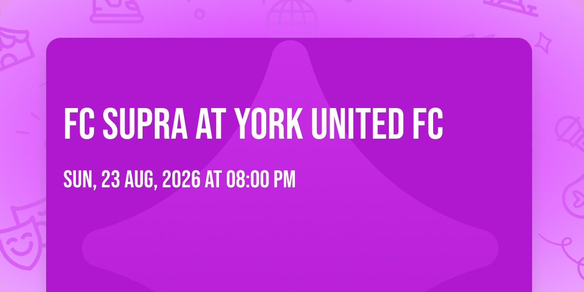 📍 Location: 43.7689, -79.5035✨ Enter a world of endless possibilities at FC Supra at York United FC, where every moment tells a story! 🏛️ The stunning York Lions Stadium in vibrant Toronto, ON transforms into a realm of wonder on August 23rd, 2026 at 08:00 PM. 🌟 They have crafted an experience that goes beyond the ordinary, combining elements of surprise, delight, and pure entertainment. Every detail has been thoughtfully considered to ensure your journey with us is nothing short of extraordinary. 🎯 Join fellow adventure seekers and memory makers in this celebration of imagination and innovation. 🎊 Reserve your spot today and be part of something truly special!