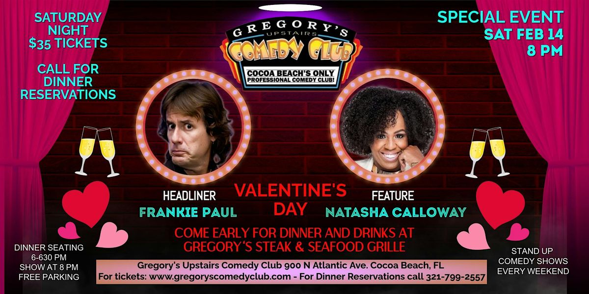 Come see the best touring comedians from all over the country performing every weekend at Gregory's Comedy Club. Seating starts 2 hours prior to showtimes. This special event headlines nationally touring comedian Frankie Paul! His fun, quirky, and relatable style has been a hit all over the country! with South Florida favorite Natasha Naomi Calloway featuring!