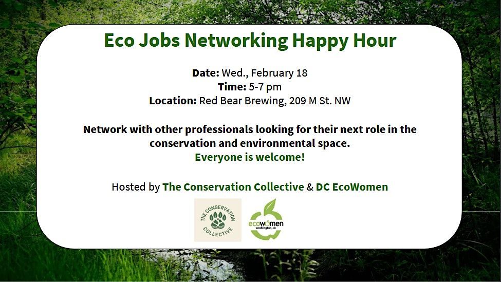 Join the Conservation Collective and DC EcoWomen for the Eco Jobs Networking Happy Hour. Network with other professionals looking for their next role in the conservation and environmental space. Everyone is welcome!