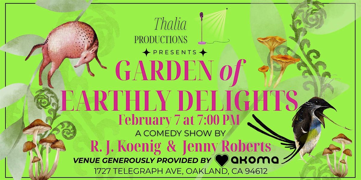 Indulge your senses in the Garden of Earthly Delights Comedy Show at Akoma. Presented by Thalia Productions, this show is packed with an all-star lineup of Bay Area leading comics including show prodcuers R.J. Koenig, Jenny Roberts, Dayton Dubois, Carinne Salnave, Eliyahu Korobkin, and other talented comics to be confirmed! Don't miss out on this unforgettable evening of delightful comedy and inspired indulgence at Akoma!