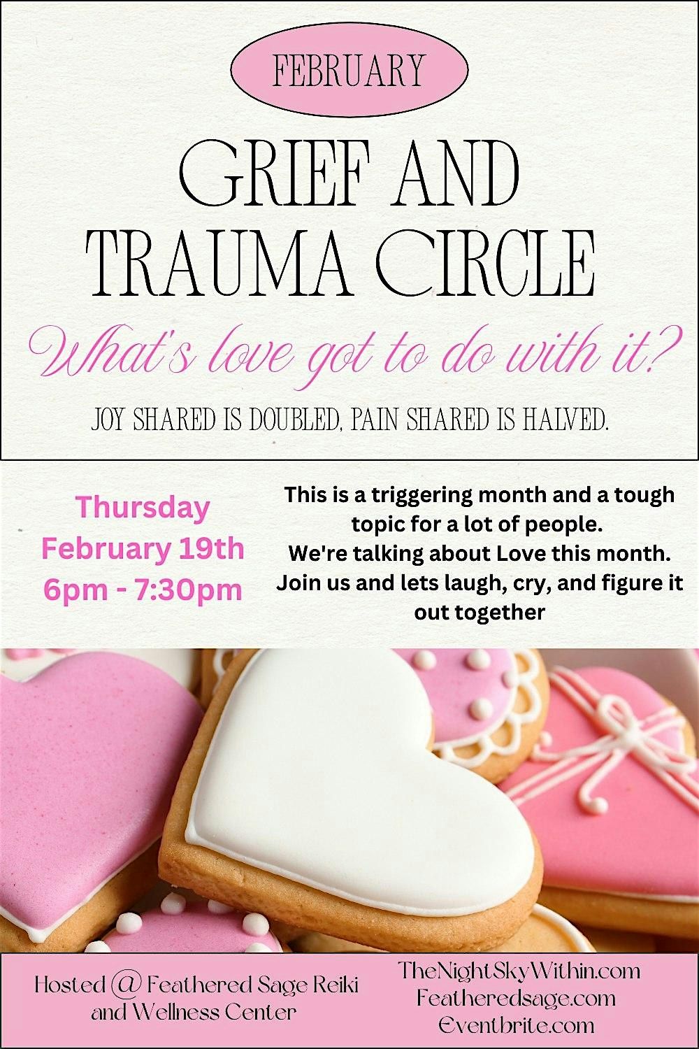 The Grief and Trauma circle is a monthly event where we come together to safely explore our wounds and our progress. Each month we have a different topic to help us heal and build our inner strength and knowing.