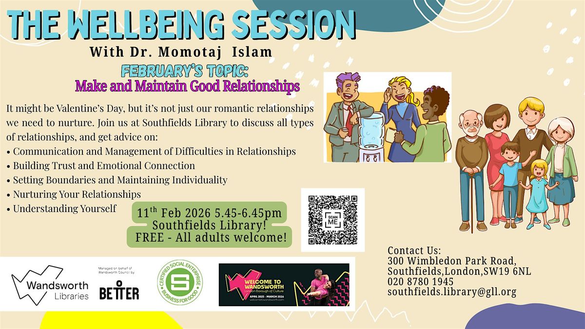 Join us in person this February to dive into some awesome tips on boosting your relationships! A friendly psychologist will share insights and advice to help you nurture and strengthen your connections. Whether you're single or partnered, there’s something valuable for everyone. Don't miss out on this chance to improve your relationship wellness in a relaxed, welcoming setting!