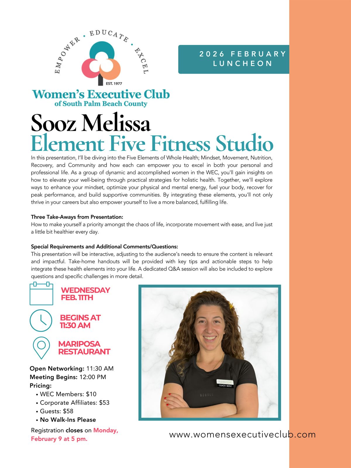 Jointhe Ladies of WEC at our new venue Mariposa's - 2nd floor of Neiman Marcus at Boca Town Center Mall. Enter throught the parking entrance. Turn right and take the elevator to the 2nd floor. Exit right and Mariposa is at the end of the hall.