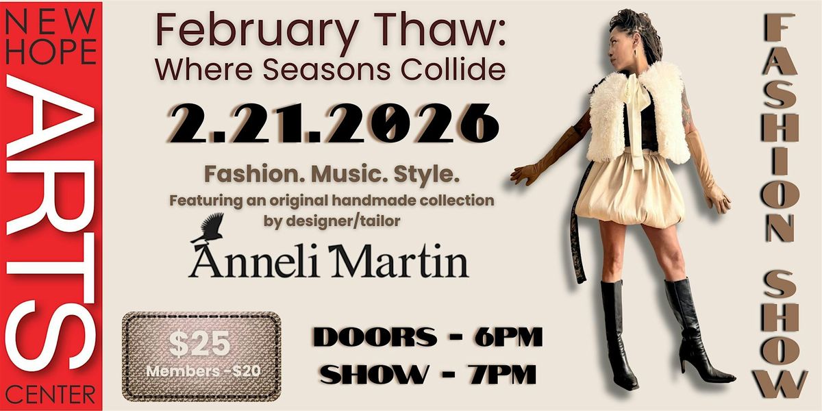 Join us for a vibrant night of fashion, music and style. Witness an original handmade collection walk the runway, then explore and shop the one-of-a-kind pieces that inspire you. Enjoy hosted drinks and bites as part of your ticket. Creative Cocktail attire encouraged. Proceeds benefit New Hope Arts. Doors open at 6 pm.