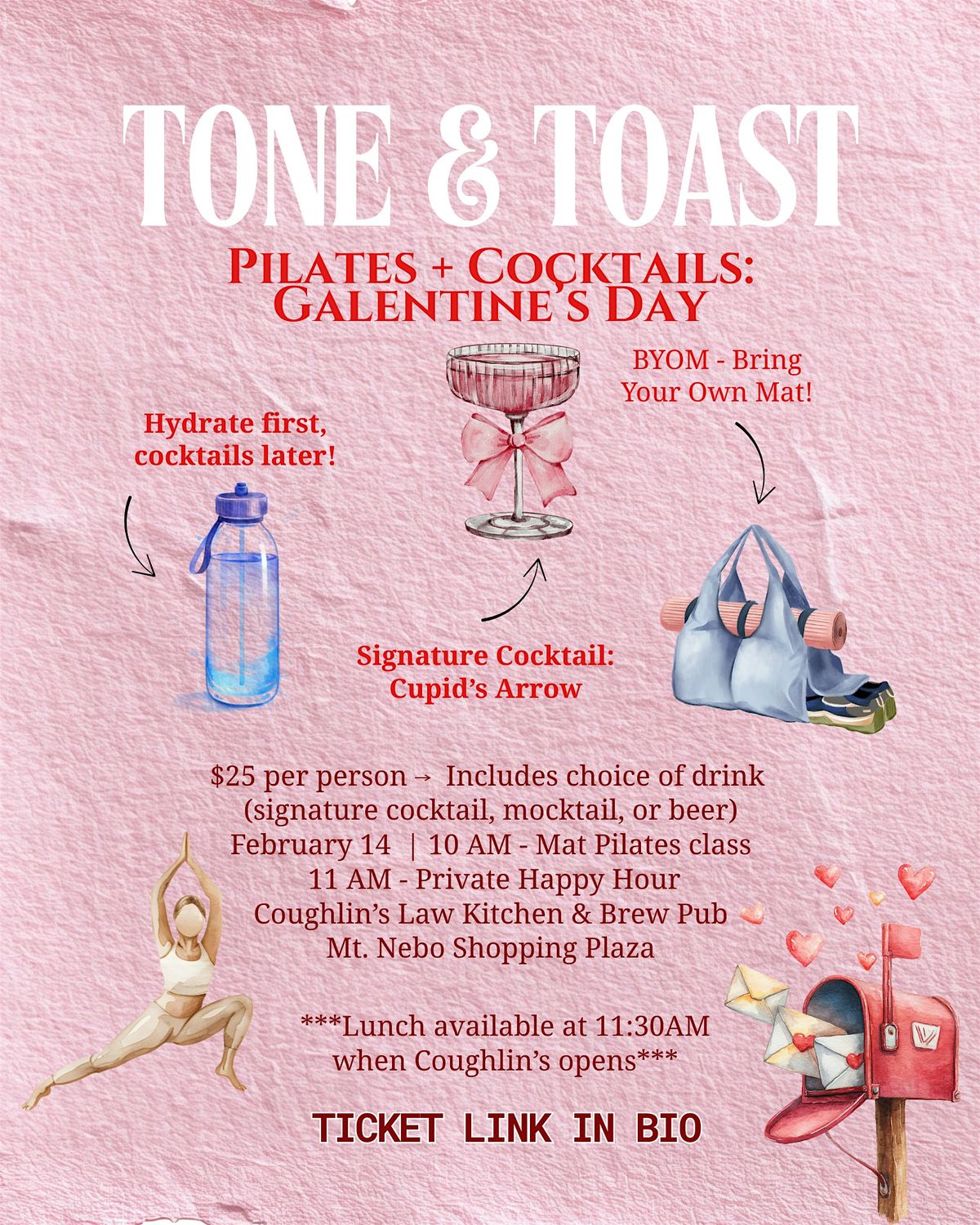 Join us Saturday, February 14th at 10am for a 50-minute Mat Pilates class with Elise at Coughlin’s Law Kitchen & Brew Pub in the Mt. Nebo Shopping Plaza.