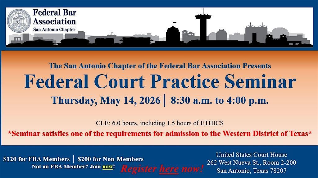 This popular seminar hosted by the San Antonio Chapter of the FBA satisfies one of the requirements for admission to practice in the Western District of Texas. It also provides previously admitted lawyers with a refresher and valuable CLE credits. This seminar addresses nine substantive topics pertinent to federal practice. San Antonio judges and prominent attorneys present all instruction. Questions during the seminar are welcome and encouraged.