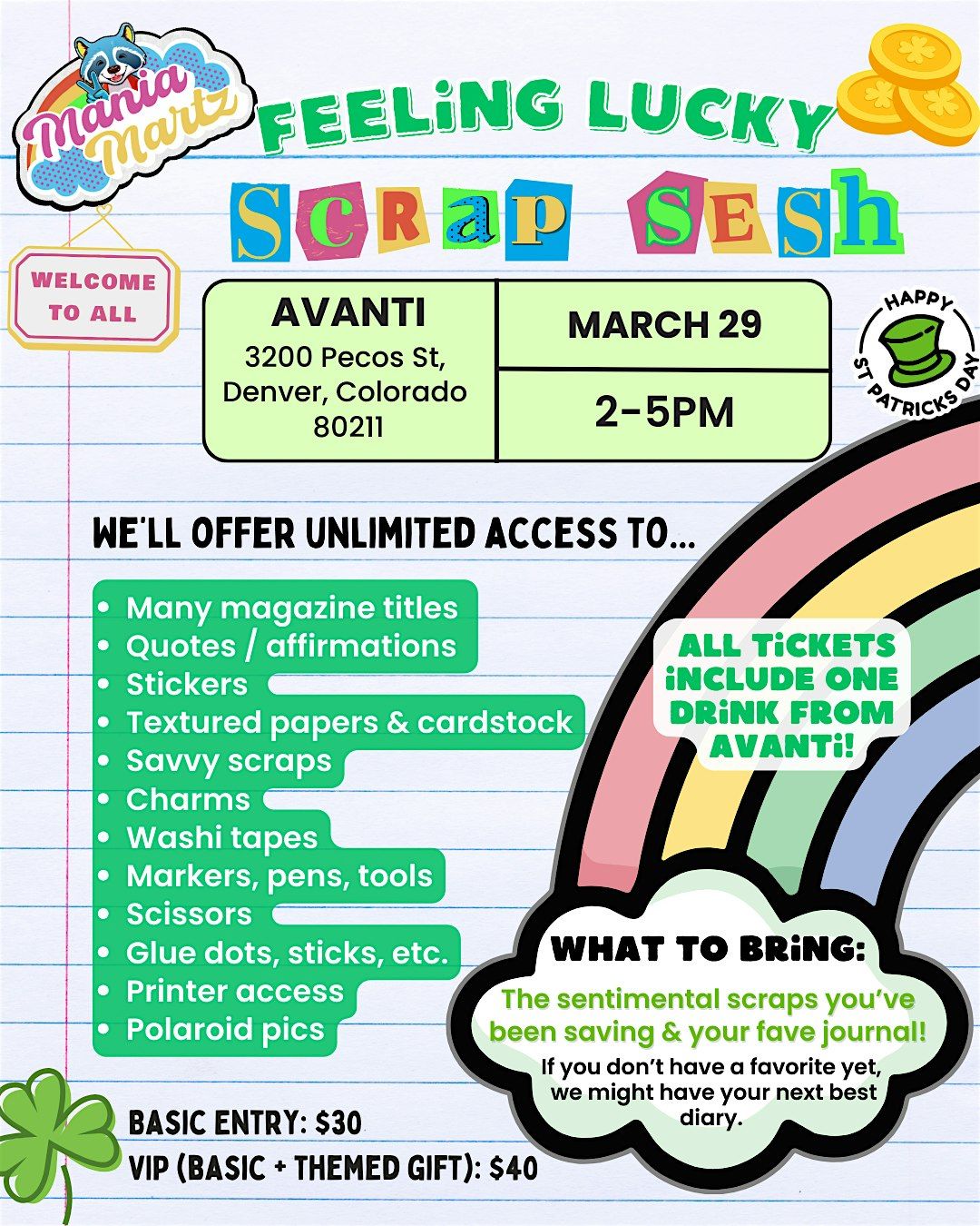 Join Mania Martz at the iconic Avanti F&B in the heart of LoHi (Lower Highland) for the Feeling Lucky Scrap Sesh. This St. Patrick’s Day-themed workshop is a festive, "welcome to all" creative social designed for local makers, journalers, and scrapbookers.