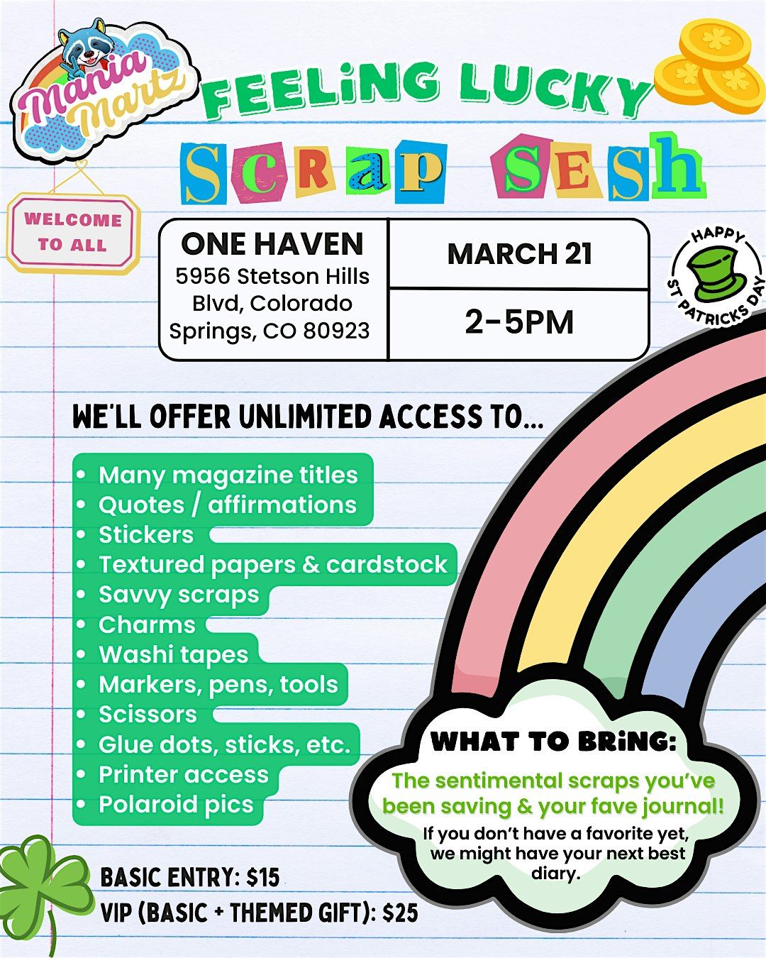 Join Mania Martz at One Haven for the Feeling Lucky Scrap Sesh. This St. Patrick’s Day themed workshop is a festive, welcome-to-all creative social designed for local makers, journalers, and scrapbookers.