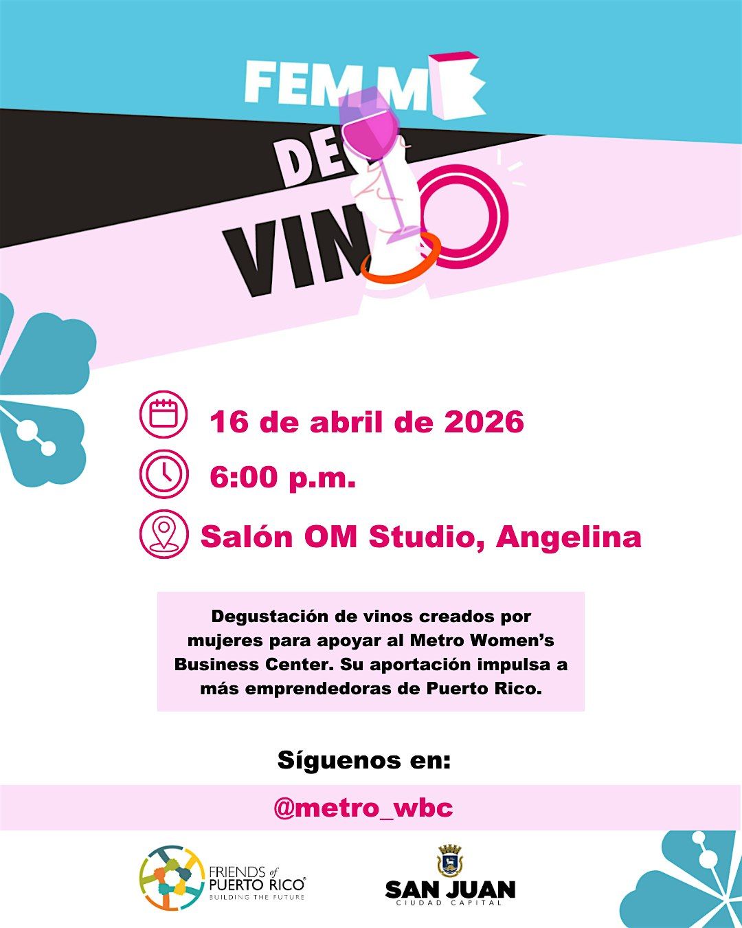 Femme de Vino 2026 es una recepción de degustación y recaudación de fondos a beneficio de Friends of Puerto Rico y su centro empresarial para la mujer, el Metro Women’s Business Center (MWBC).