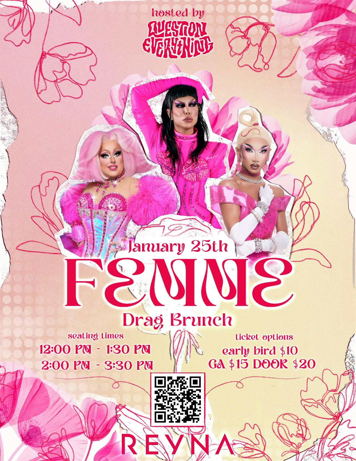 FEMME Drag Brunch is a chic, elevated drag brunch celebrating femininity in all its forms. Set inside the intimate, sun-washed space of Bar Reyna, FEMME blends polished drag performances, pop diva energy, and a warm interactive brunch experience that feels empowering, joyful and effortlessly glamorous.