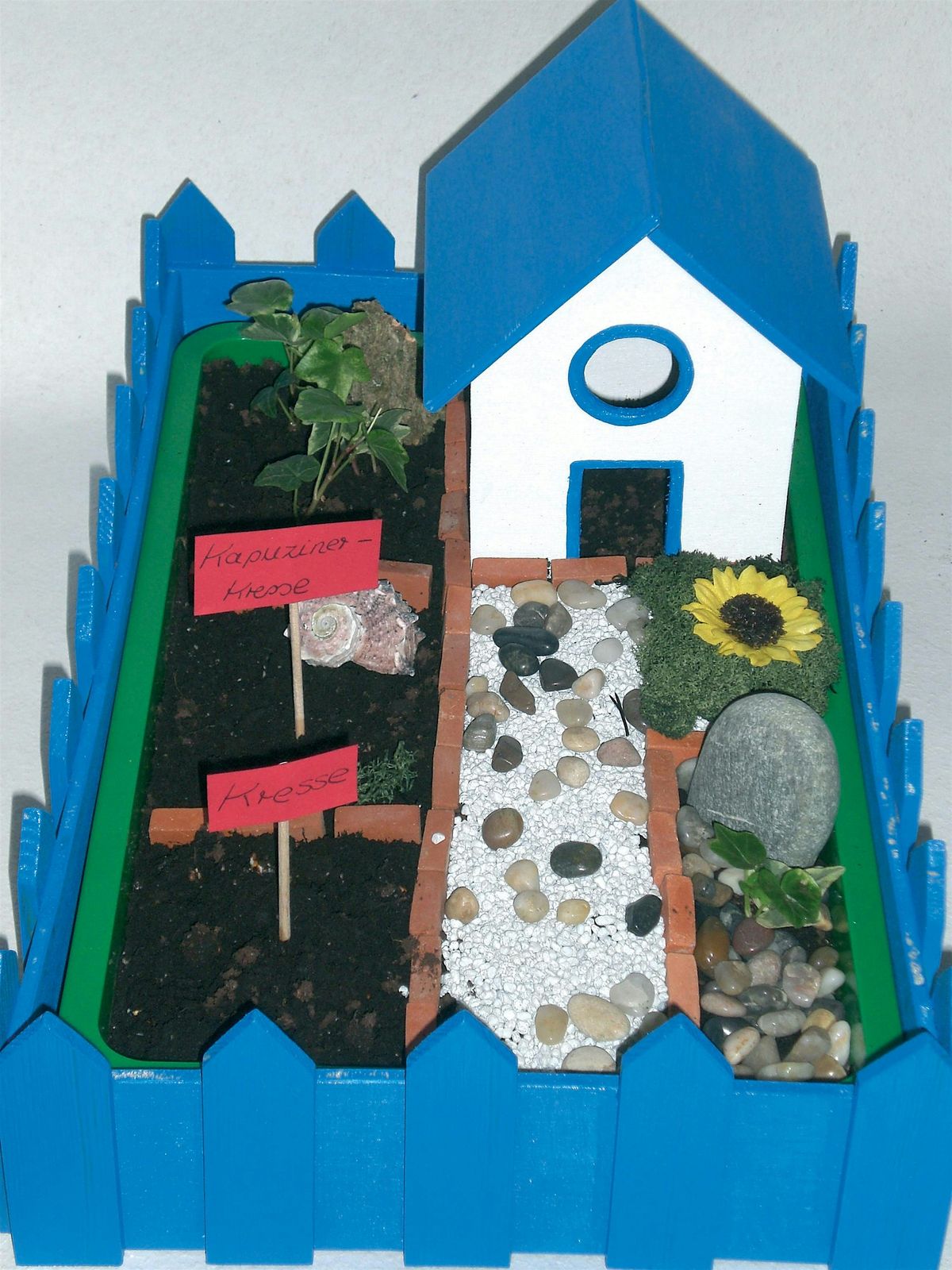 Gestaltet euch ganz besondere kleine Gärten für die Fensterbank. Baut euch in großen BlumentopfUntersetzern oder Holzkistchen kleine fantasievolle Häuschen und Windspiele, legt bunte Beete und verschlungene Wege an. Und pflanzt in euren kleinen Gärtchen bunte Blumen oder schnell wachsende Kresse an. Vielleicht darf in eure Gärtchen ja auch gleich eine kleine Fee miteinziehen.