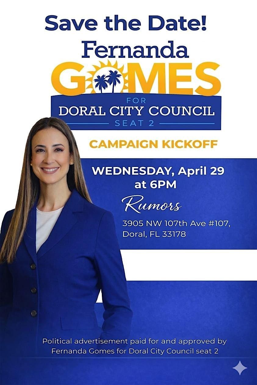 Join us as we officially kick off the campaign of Fernanda Gomes for the City of Doral! This exciting evening will bring together community.