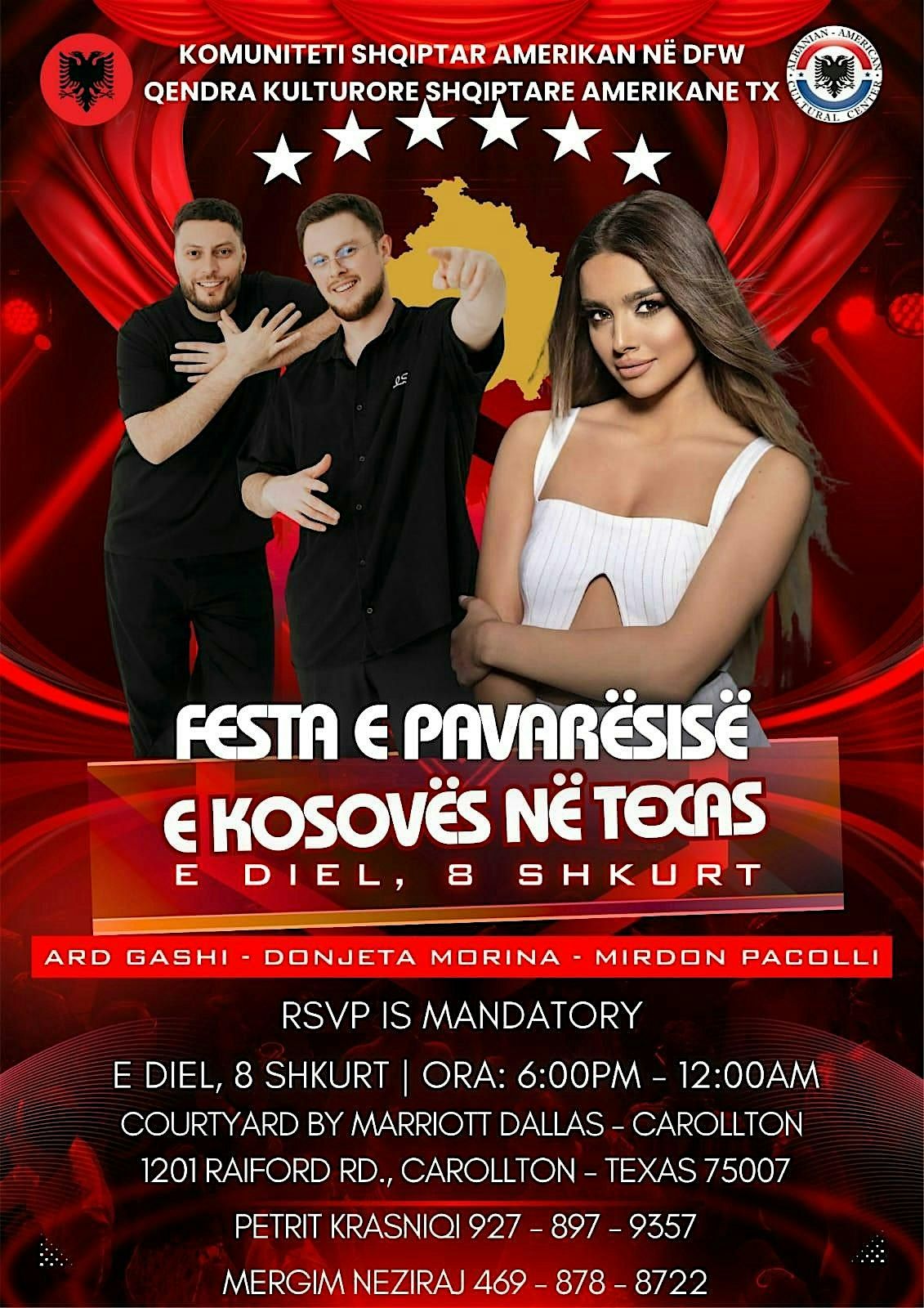 Bashkohuni me ne për një mbrëmje të paharruar, me valle dhe këngë shqiptare të kënduara nga artistët e njohur për herë të parë në Texas, ARD GASHI, DONJETA MORINA dhe MIRDON PACOLLI.