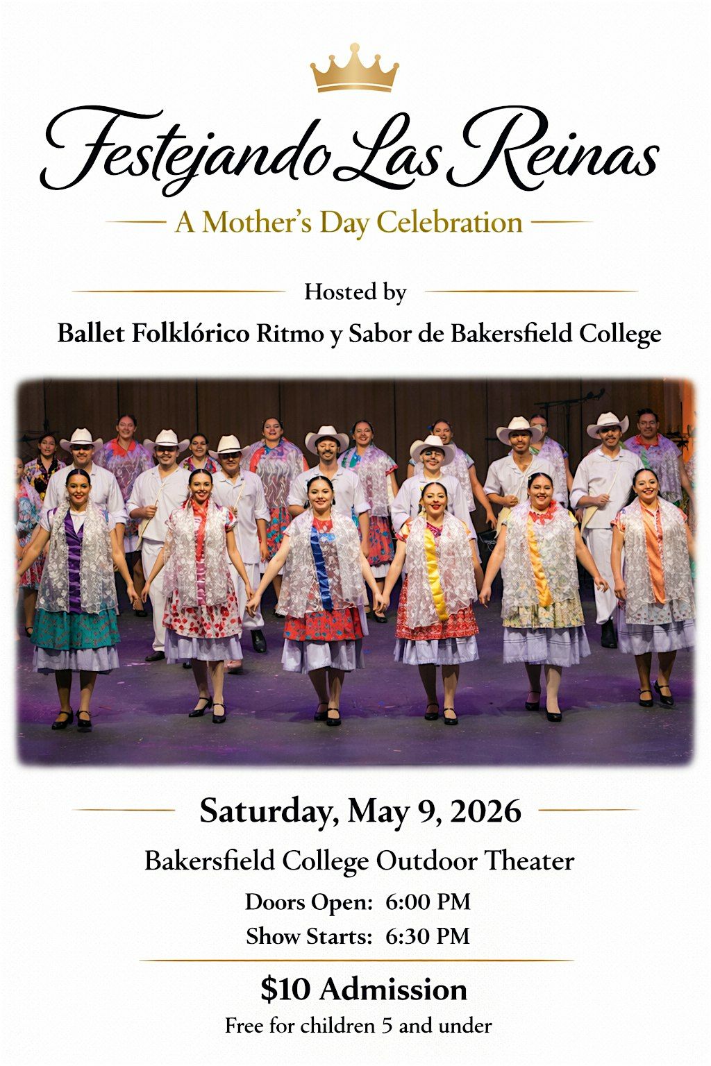 Join us for an unforgettable evening of culture, celebration, and community at Festejando Las Reinas: A Mother’s Day Celebration. Hosted by Ballet Folklórico Ritmo y Sabor de Bakersfield College, this special performance honors the strength, beauty, and love of mothers through the vibrant traditions of Mexican folklórico dance.