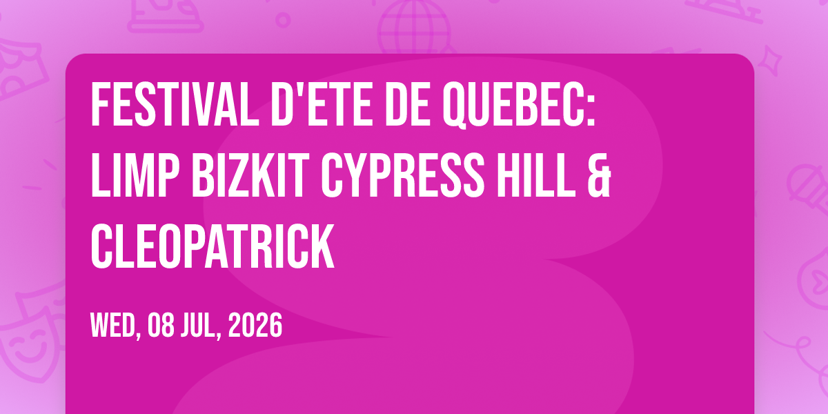 🌟 Be part of history at Festival D'ete De Quebec: Limp Bizkit Cypress Hill & Cleopatrick, an extraordinary gathering that will captivate your imagination! 🏛️ The prestigious Plains Of Abraham in Quebec, QC sets the stage for an unforgettable experience on July 8th, 2026 at 07:00 PM. ✨ They are bringing together the finest elements of entertainment and innovation to create moments that will take your breath away. From the moment you arrive, you'll be immersed in an atmosphere of wonder and excitement. 🎯 This carefully planned event ensures every guest experiences something truly special. 🎊 Early booking is recommended for this must-attend event of the season!http://maps.seatics.com/PlainsOfAbraham_Festival_2019-08-28_2019-08-28_1017_SVGC_tn.gif
