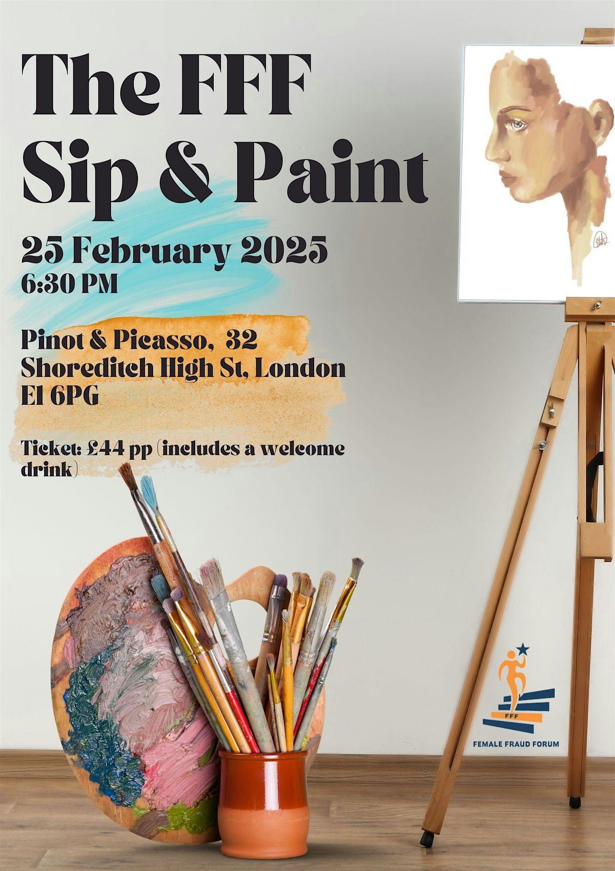 Attendees are asked to arrive at the venue at 6.30pm. There will be welcome drinks for everyone (including non-alcoholic options), before a fun and informal painting class.