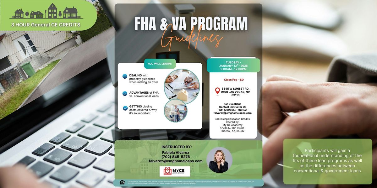 Join us for an in-depth FHA & VA Program Guidelines class designed for real estate professionals looking to strengthen their understanding of government loan programs. This 3-hour General CE Credit course breaks down how FHA and VA loans compare to conventional financing, how property guidelines affect offers, and how closing costs can be structured to better serve buyers.