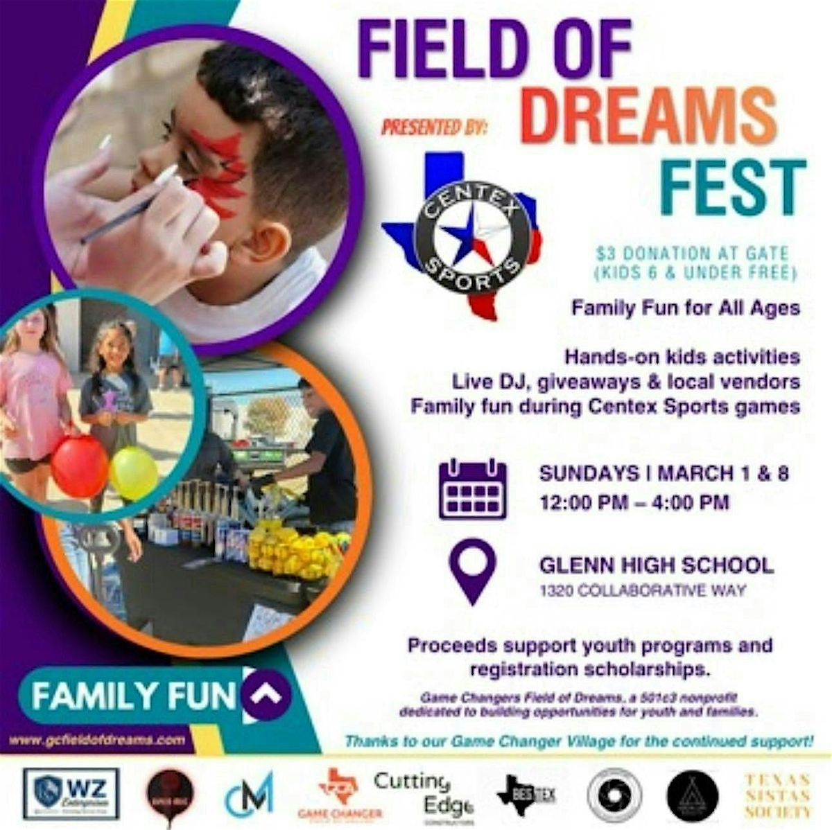 Your entry helps support Game Changers Field of Dreams, a nonprofit dedicated to creating opportunities and scholarships for youth athletes in our community. Every smile, snack, and cheer goes back into supporting these kids!