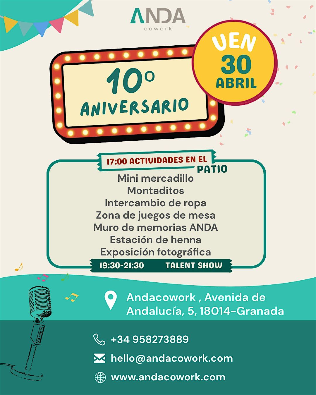 Anda Cowork celebra su 10º aniversario. Estás invitado/a a venir, celebrar con nosotros y/o conocernos. Habrá un mini mercadillo, montaditos, intercambio de ropa, una zona de juegos de mesa, una estación de henna y una exposición fotográfica. A partir de las 19:00 habrá un pequeño concierto. ¡Ven y celebra con nosotros! 🎉