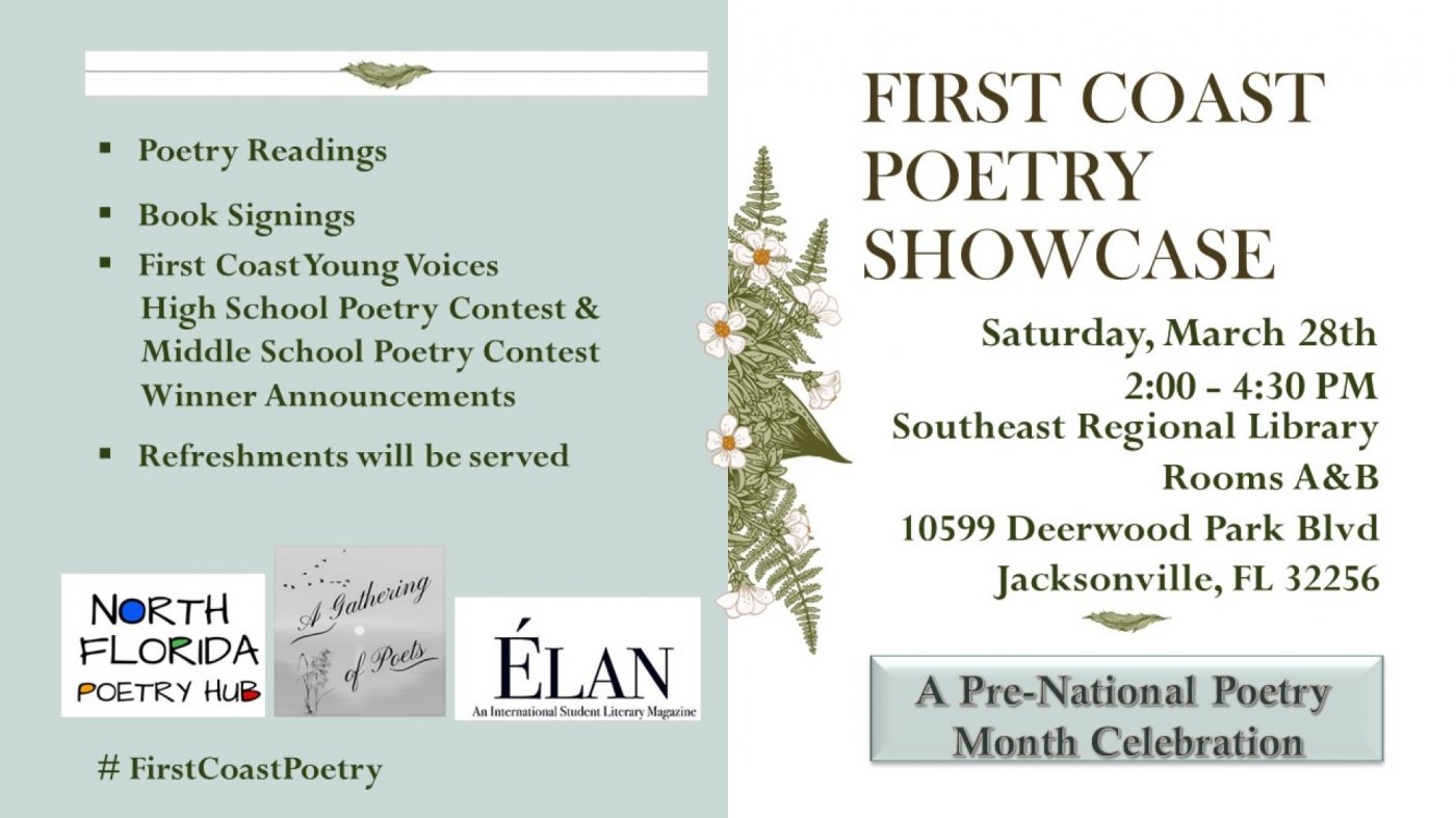 On March 28th from 2 to 4:30 p.m. at the Southeast Regional Library in Jacksonville, the First Coast Poetry Showcase will host readings by members of the North Florida Poetry Hub, A Gathering of Poets, and Élan Magazine, a student international literary magazine from Douglas Anderson School of the Arts in an early celebration of National Poetry Month.