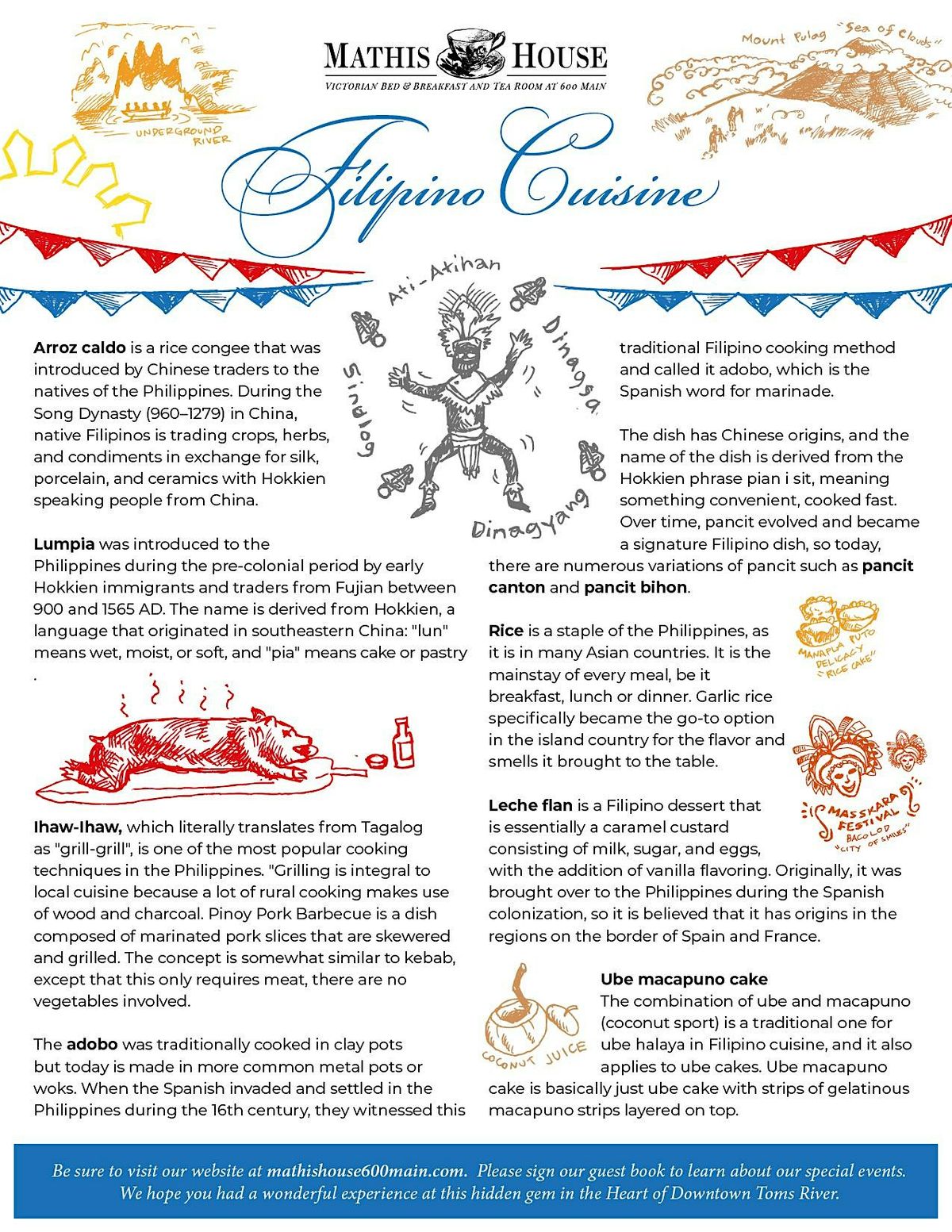 The Mathis House is bringing a touch of culture and authentic Filipino Cuisine to Toms River.Please join us at the Mathis House for a wonderful meal of authentic Filipino dishes.The menu includes: