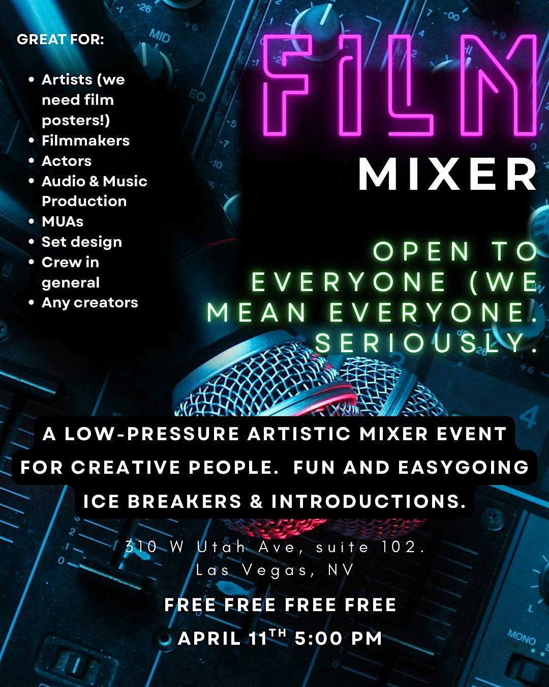 Whether you’re planning to enter our upcoming film challenge or just want to vibe with the local scene, this mixer at SPCKRFT Studios is designed to get the Las Vegas creative community in one room to actually make things happen. This is a high-energy, low-pressure space for actors, musicians, MUAs, and directors to connect, talk shop, and potentially find the exact crew members needed to dominate the Cine-Sprint: Golden Hour Challenge.