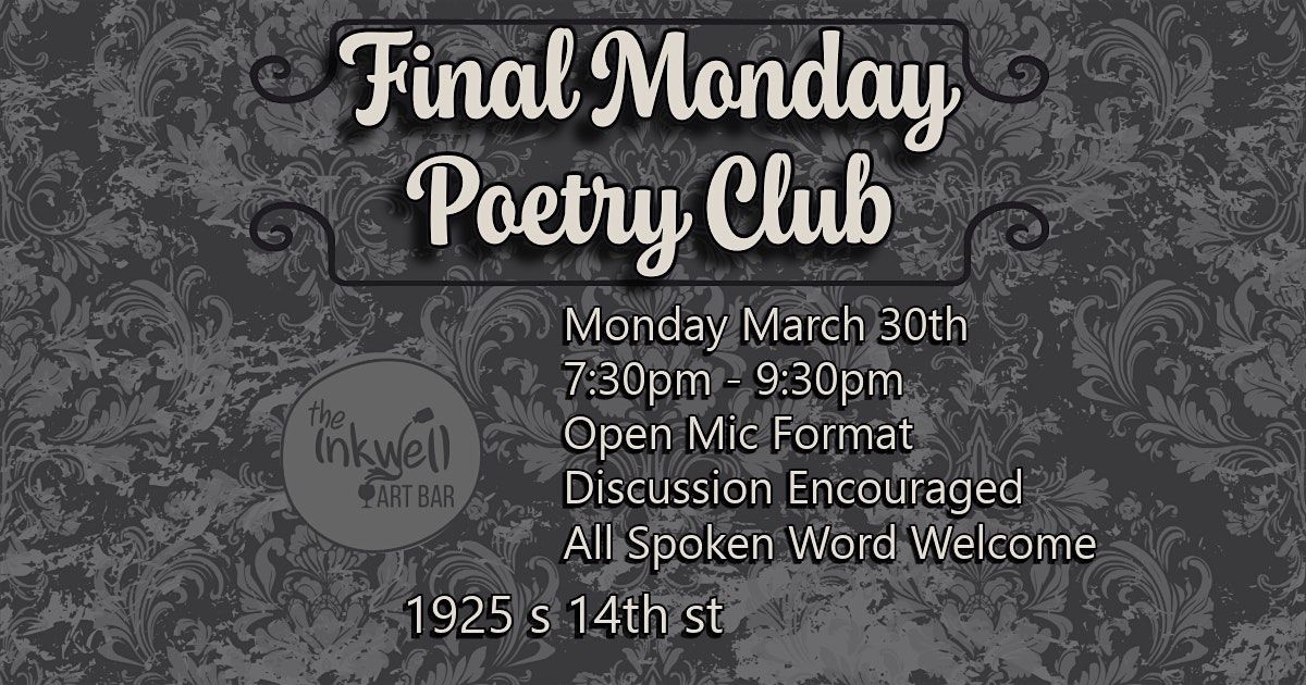 Final Monday Poetry Club is a new monthly gathering at The Inkwell for writers, readers, and anyone who loves the spoken word. Held on the last Monday of each month, this open mic night welcomes poetry, short stories, monologues, and other original works in a relaxed listening-room setting.