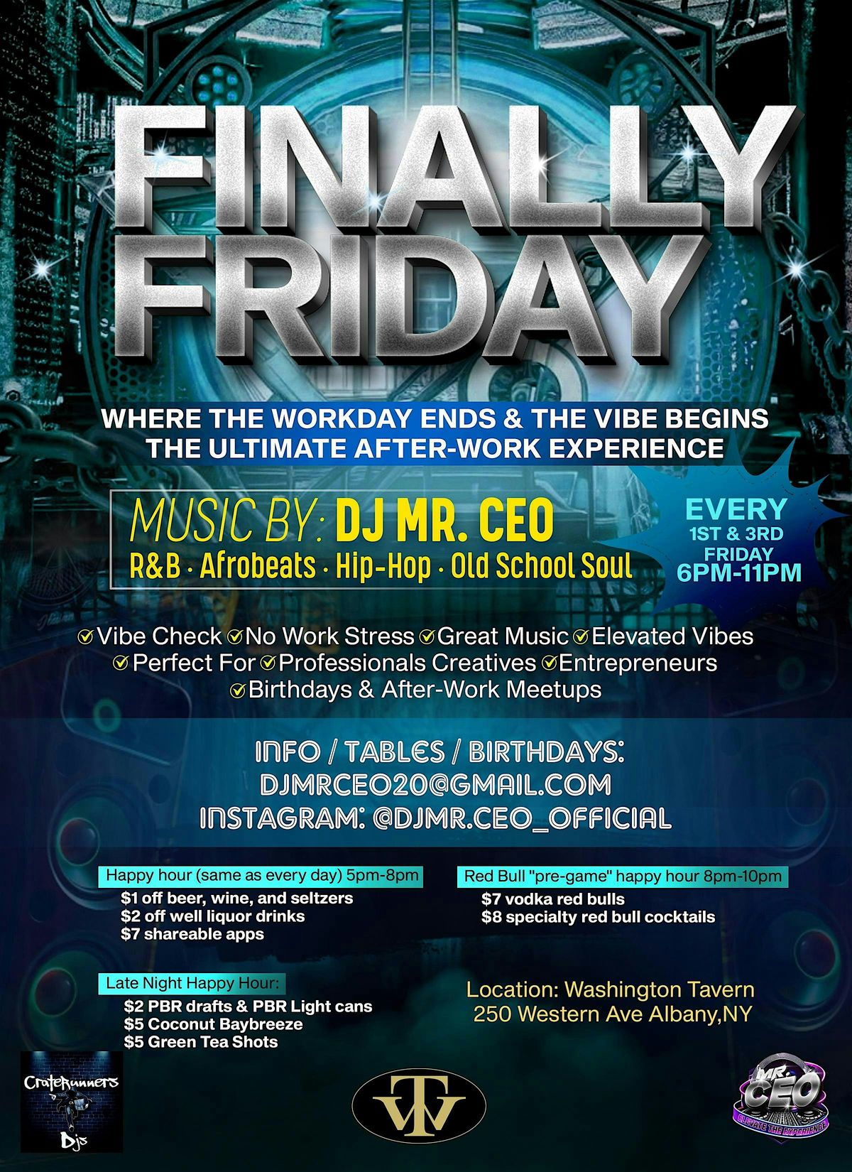 FINALLY FRIDAY Where the Workday Ends & the Vibe BeginsThe Ultimate After-Work Experience 1ST & 3RD EVERY FRIDAY 6PM – 10PMLocation: [WASHINGTON TAVERN][250 WESTERN AVE ]Music By:DJ MR. CEOR&B • Afrobeats • Hip-Hop • Old School SoulVibe CheckNo Work StressGreat MusicElevated VibesPerfect For • Professionals• Creatives• Entrepreneurs• Birthdays & After-Work MeetupsDress Code:After-Work Chic | Grown & StylishInfo / Tables / Birthdays:[email protected]: @DJMR.CEO_OFFICIAL