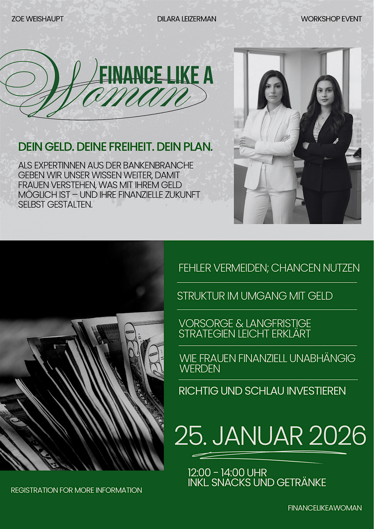 In diesem Workshop vermitteln wir Frauen praxisnah und verständlich, wie sie ihre Finanzen heute sinnvoll aufstellen und für die Zukunft absichern können. Als Expertinnen aus der Bankenbranche bringen wir fundiertes Fachwissen mit und verbinden es mit unserer heutigen Selbstständigkeit und echter Beratungserfahrung.
