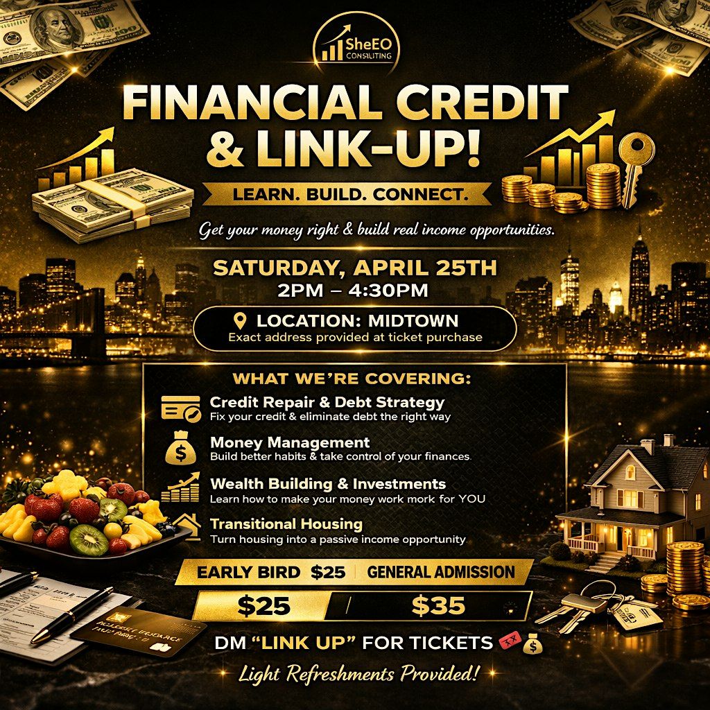 Join us for an elevated Financial + Credit Link Up designed to educate, empower, and connect. This experience will cover credit repair, financial strategy, and wealth-building, giving you real tools to take control of your finances.