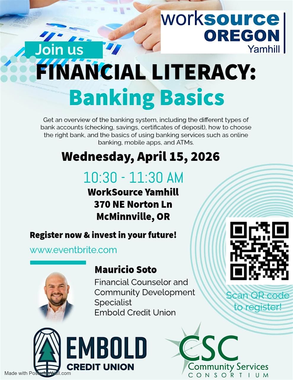 This one hour class gives an overview of the banking system, including different types of bank accounts (checking, savings, certificates of deposit), how to choose the right bank, and the basics of using banking services such as online banking, mobile apps, and ATMs. The class is led by certified financial counselor Mauricio Soto in partnership with Embold Credit Union, Community Services Consortium and WorkSource.