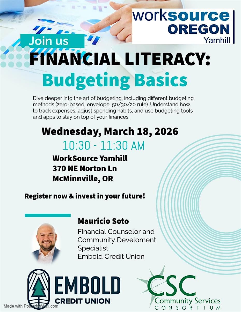 Ready to take control of your money? Join us in person for a fun and easy-going session all about budgeting basics. Learn how to track your expenses, set spending limits, and make your cash work for you. Whether you're a budgeting newbie or just need a refresher, this event is perfect to get your finances on track. Don't miss out on some practical tips and a chance to ask your money questions face-to-face! Presented by Embold Credit Union in partnership with Community Services Consortium and WorkSource Yamhill.