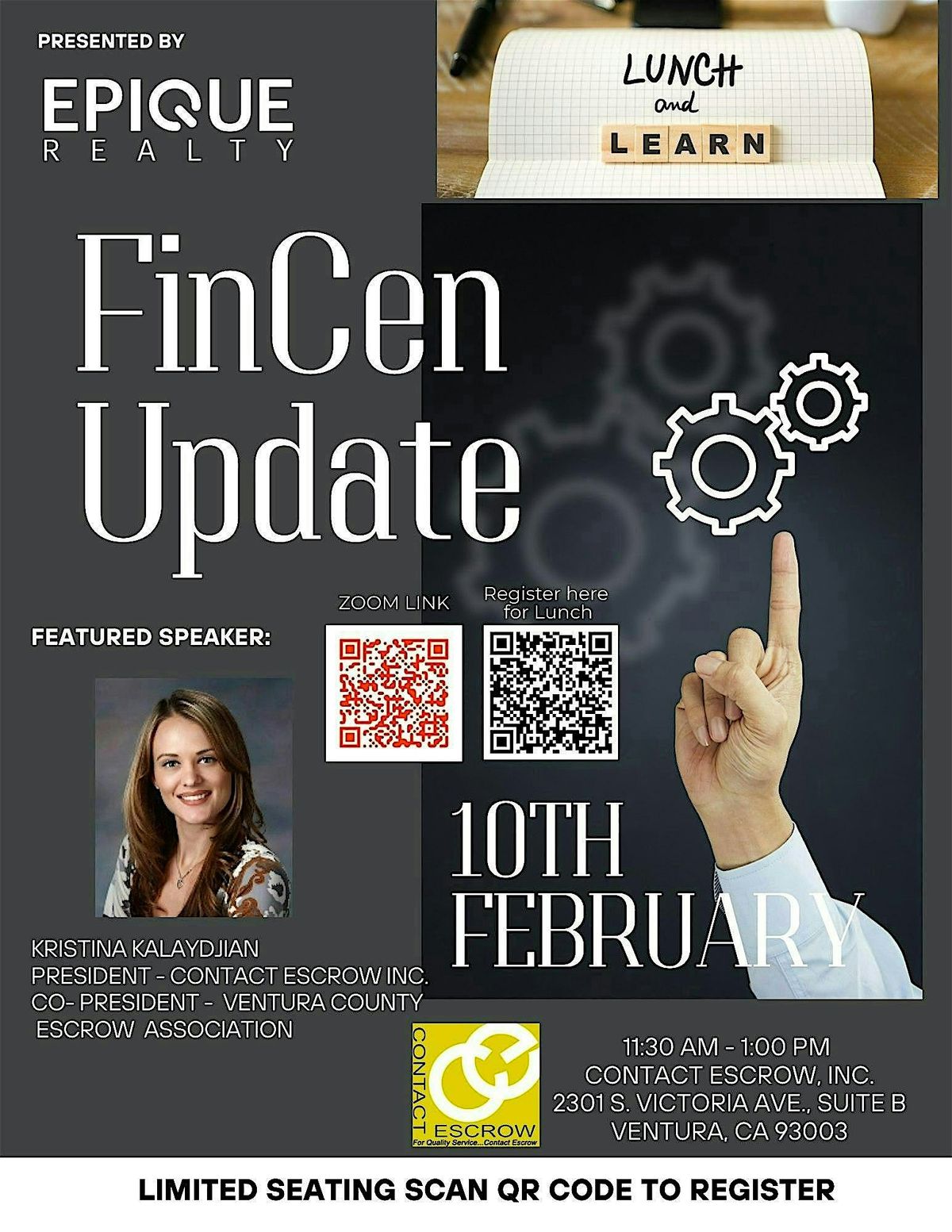 Welcome to the FinCen update For REALTORS event! 🏡 Join us at Contact Escrow on February 10, 2026 at 11:30 AM (Pacific Time) for an informative session on the latest updates from FinCen that directly impact real estate professionals. Stay ahead of the curve and ensure compliance in your transactions. Don't miss out on this opportunity to network with industry peers and gain valuable insights. See you there!