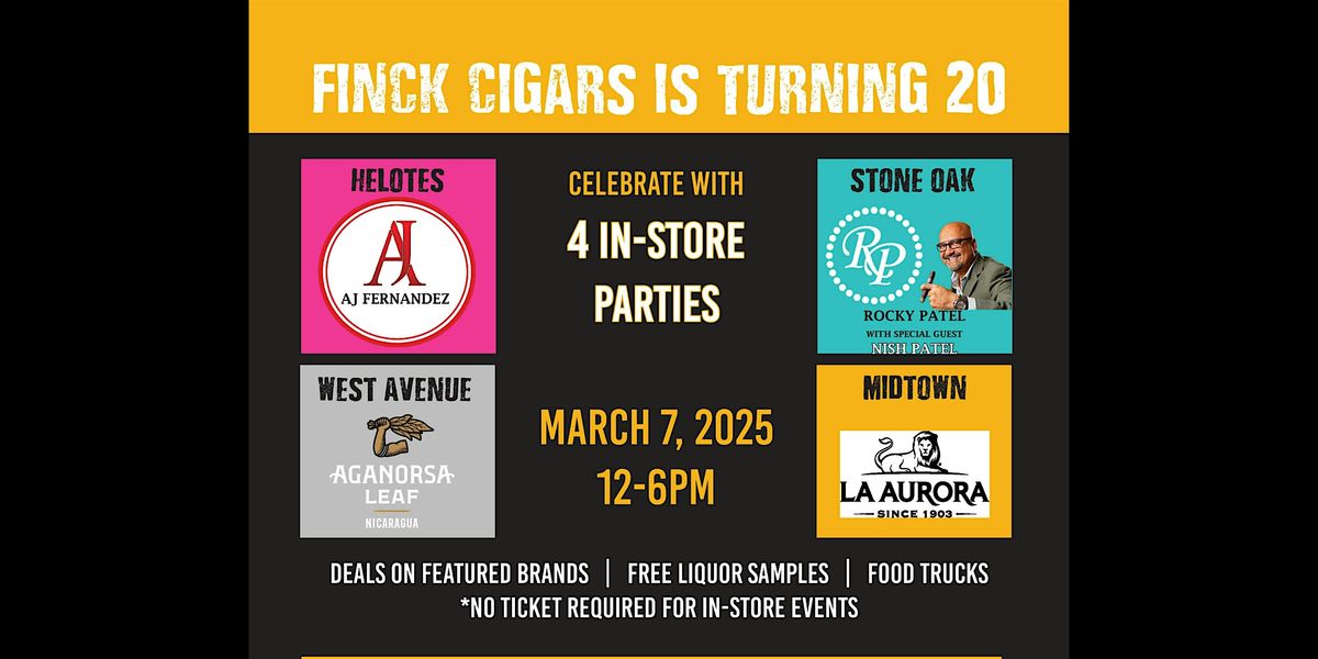 Don’t miss this milestone celebration. Mark your calendar for Saturday, March 7, 2026, and get ready for an unforgettable day at Finck Cigars’ 210 Cigar Crawl. Thank you for shopping local and making Finck Cigars your cigar store for 20 years!