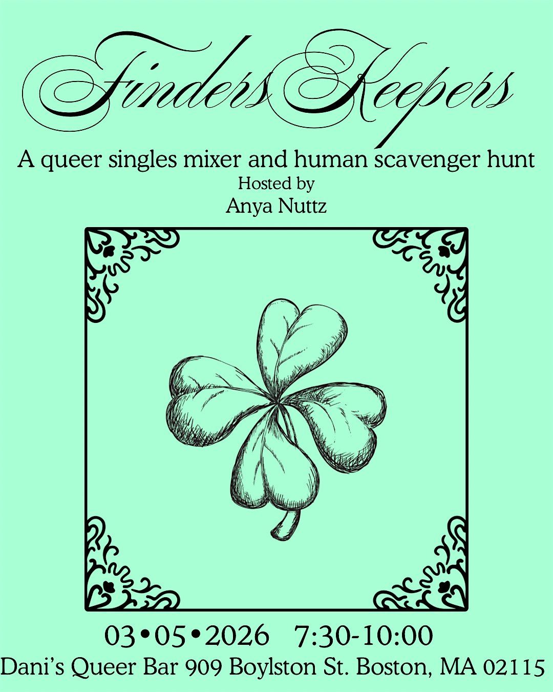Come to the basement of Dani’s and find the love of your life… or someone you just want to kiss. Once you check in you will get a checklist of scavenger hunt prompts to complete or to ignore while you flirt your way around the room. If you don’t check in by 9 entry is subject to capacity of the space. Happy flirting and happy hunting.