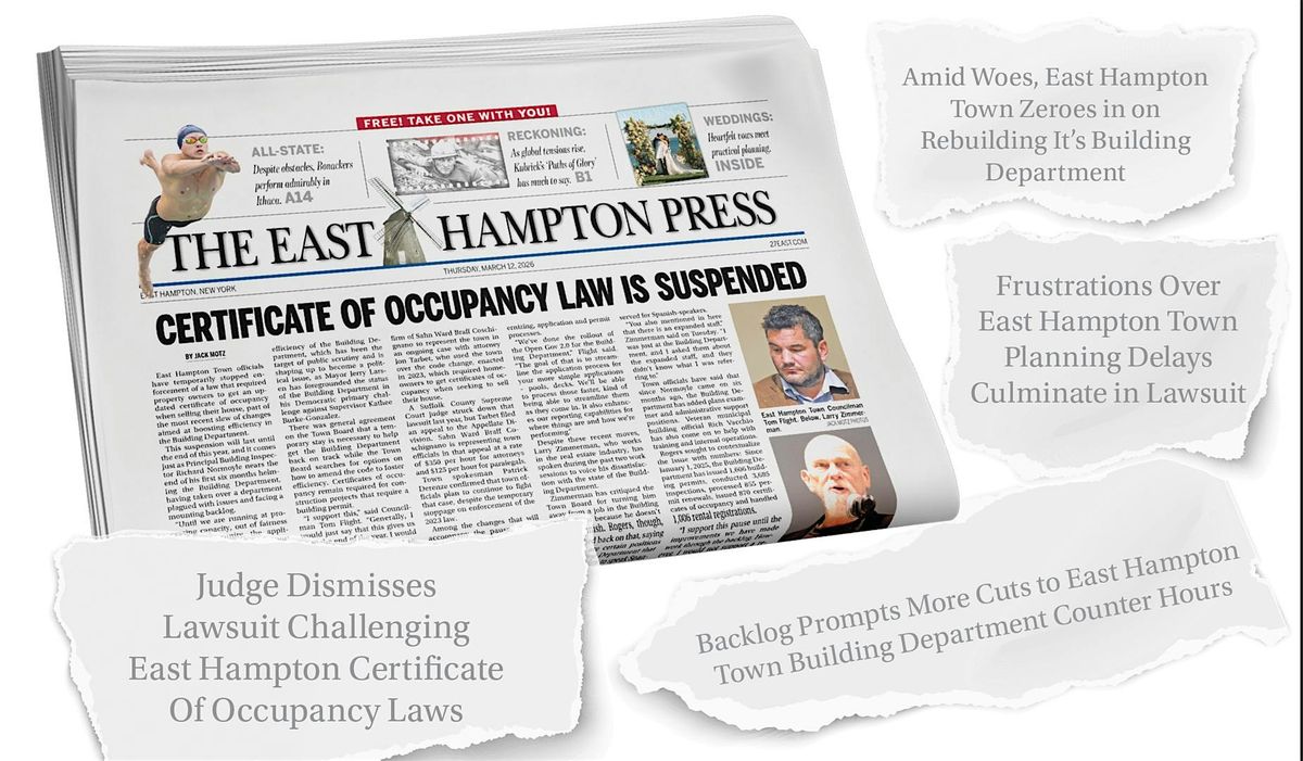 In early March, East Hampton town officials suspended enforcement of a recent law that requires homeowners to get an updated certificate of occupancy before selling their home. It was the most recent change at the East Hampton Town Building Department intended to boost efficiency and shepherd land use applications through an office that has faced turnover and a mounting backlog. All this as the town has heralded zoning code changes designed to reduce home sizes in the face of ever increasing development pressures. The conversation will ask how the town is dealing with a “perfect storm” in the department, and how developers are meeting the daily challenges of getting their projects approved.