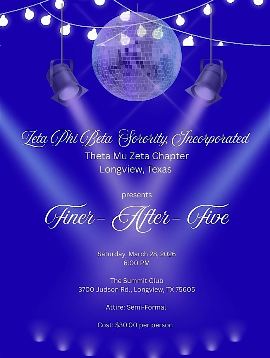 β¨ Join us for an unforgettable evening of elegance and fellowship! Zeta Phi Beta Sorority Incorporated proudly presents **Finer β After β Five**. Put on your semi-formal attire and come enjoy a beautiful night of music, connection, and celebration.