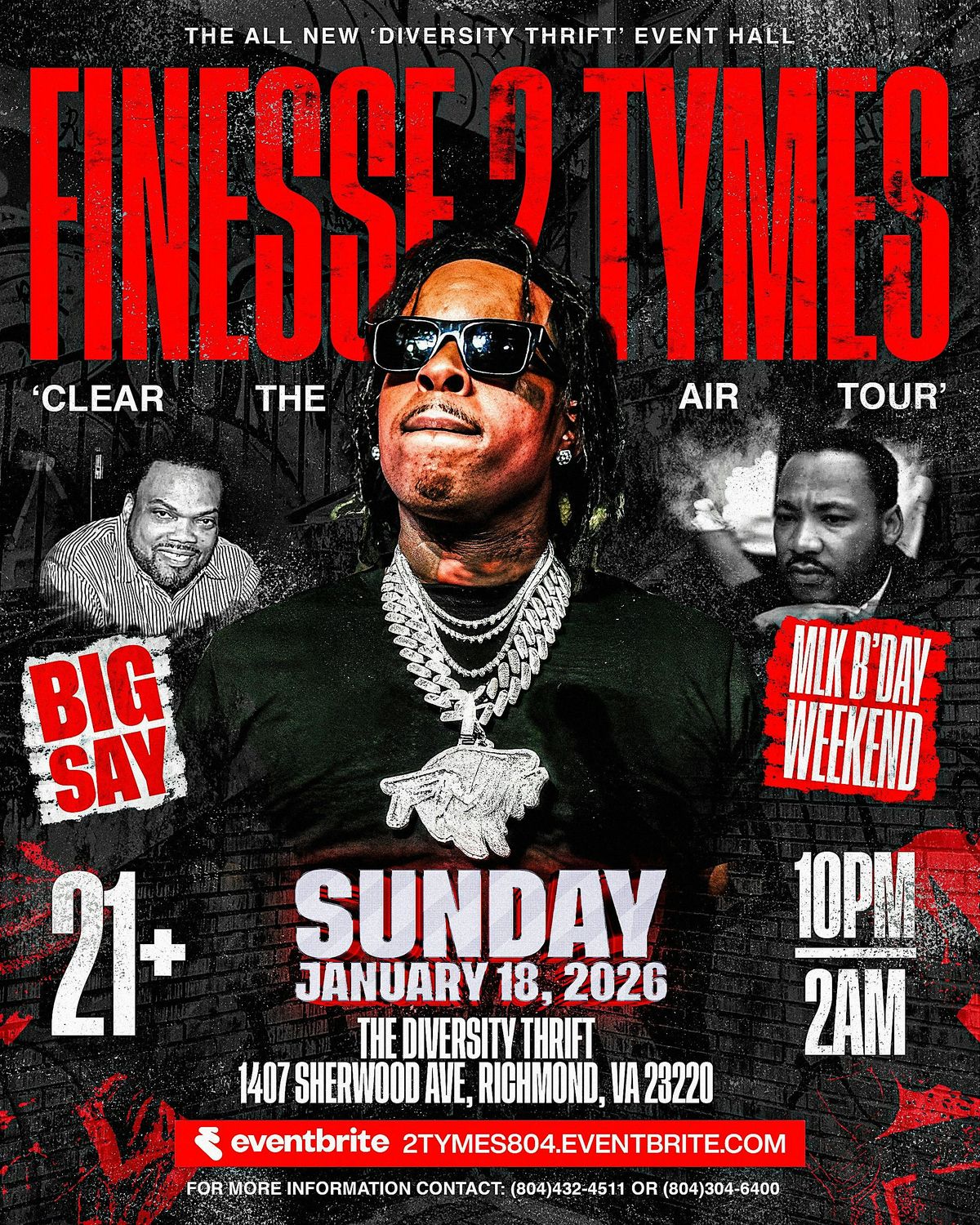 Welcome to the "Clear The Air Tour" event featuring live performances by Finesse 2 Tymes. Tribute to "Big Say" StreetRat Promotion and MLK weekend celebration! Join us at Diversity Thrift on January 18, 2026 at 10:00 pm for a night filled with music, dance, and great vibes. Let's come together to honor MLK's legacy and enjoy some amazing performances. Don't miss out on this special event!