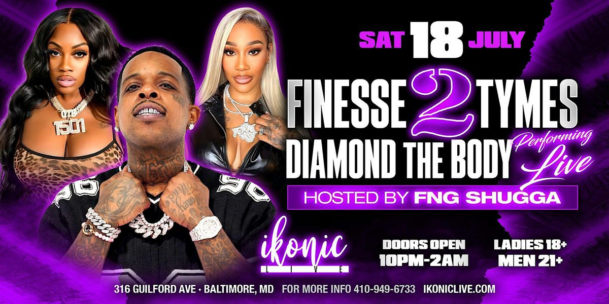 Get ready for a Ikonic night with Finesse2Tymes and Baddies own Diamond The Body at Ikonic Live. Join us on July 18, 2026 at 10:00 PM (Eastern Time) for an unforgettable in-person show. Don’t miss out on the energy, the music, and the whole experience. Bring your friends and let’s make it a night to remember!