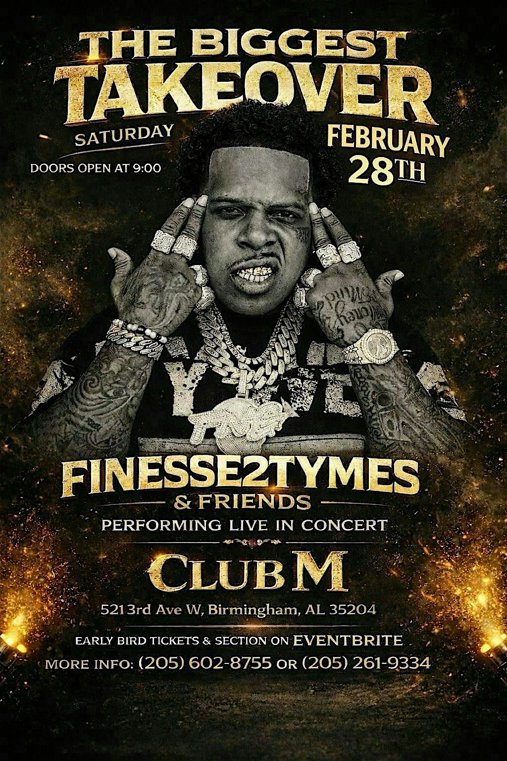 Welcome to Finesse2Tymes & Friends live in concert in Birmingham at Club M! Get ready for a night of unforgettable performances on February 28, 2026 at 9:00pm (Central Time). Join us for an incredible show filled with music, fun, and good vibes. Don't miss out on this opportunity to see your favorite artists live on stage. Mark your calendars and get ready to party with us at Club M!