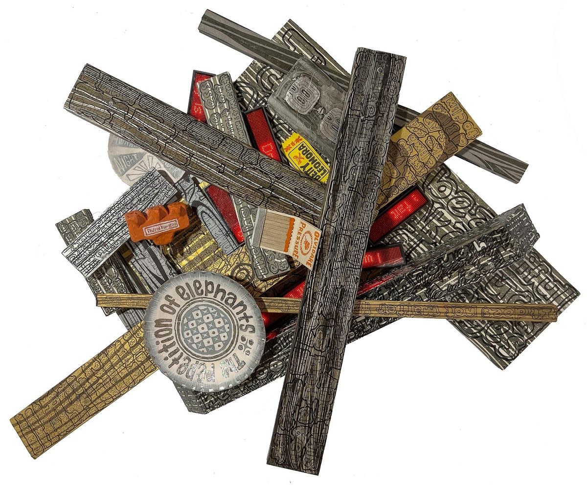 Image Credit: Bachrun LoMele, Burn Pile / All Kinds of Murmuring Here and There (detail), 2022, Relief prints on paper mounted on gatorboard, oil pen, markers, ink, paper maché, paper clay, aluminum leaf, aluminum foil, acrylic paint, running LED signs, scrambled, donated truth essences. Courtesy of the Artist.